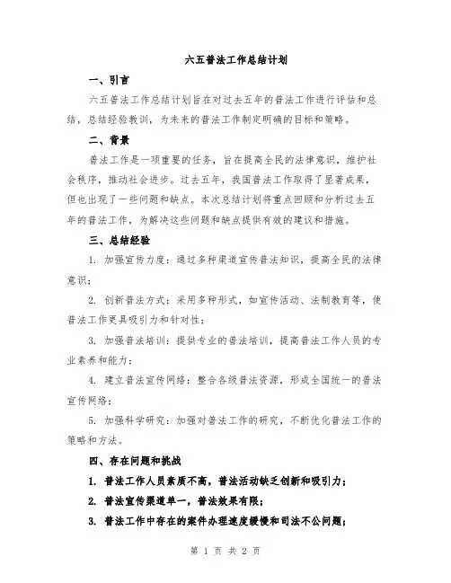 六五普法工作总结计划一、引言六五普法工作总结计划旨在对过去五年的普法工作进行评估和总结,总结经验教训,为未来的普法工作制定明确的目标和策略。