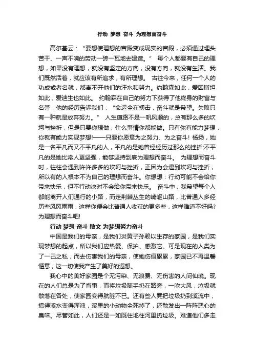 奋斗中,我希望每个人都能离开人们通行的小路,而走荆棘丛生的崎岖山路,比普通人多经历些风风雨雨,这样你便会比普通人收获的更多些,这样难道不好吗? 为理想而奋斗吧!行动梦想奋斗散文为梦想努力奋斗中国是我们的母亲,是我们炎黄子孙赖以生存的家园,是我们实现梦想的起点,所以我们应热爱、保护、感激它。
