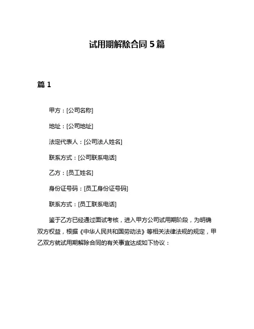 试用期解除合同5篇篇1甲方:[公司名称]地址:[公司地址]法定代表人:[公司法人姓名]联系方式:[公司联系电话]乙方:[员工姓名]身份证号码:[员工身份证号码]联系方式:[员工联系电话]鉴于乙方已经通过面试考核,进入甲方公司试用期阶段,为明确双方权益,根据《中华人民共和国劳动法》等相关法律法规的规定,甲乙双方就试用期解除合同的有关事宜达成如下协议:一、协议目的本协议的签订旨在明确甲乙双方试用期解除合同的条款及流程,以保障双方的合法权益。