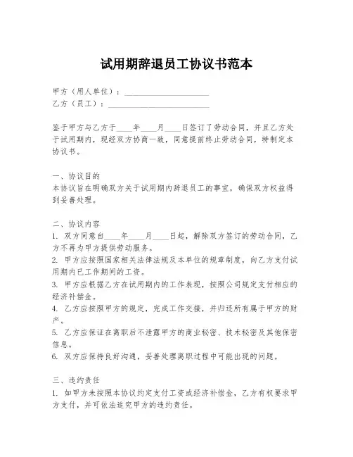 员工试用期解除劳动合同协议范本6篇篇1甲方(公司):_________________________乙方(员工):_________________________鉴于甲乙双方于______年______月______日签订了劳动合同,现因试用期解除事宜,双方根据相关法律法规的规定,经友好协商,达成如下协议:一、协议目的双方同意在试用期届满前解除劳动合同,并按照本协议约定处理好相关事宜。