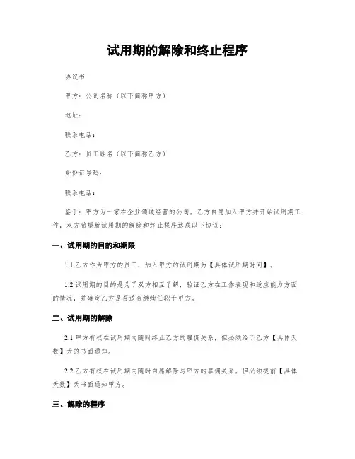 四、试用期终止劳动合同的程序1. 甲方应在试用期结束前,向乙方发出书面通知,明确终止试用期劳动合同的事宜。