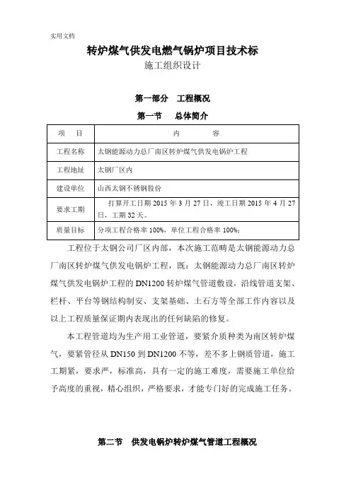 转炉煤气供发电燃气锅炉项目技术标施工组织设计第一部分工程概况第一节总体简介工程位于太钢公司厂区内部,本次施工范畴是太钢能源动力总厂南区转炉煤气供发电锅炉工程,既:太钢能源动力总厂南区转炉煤气供发电锅炉工程的DN1200转炉煤气管道敷设,沿线管道支架、栏杆、平台等钢结构制安、支架基础、土石方等全部工作内容以及以上工程质量保证期内表现出的任何缺陷的修复。