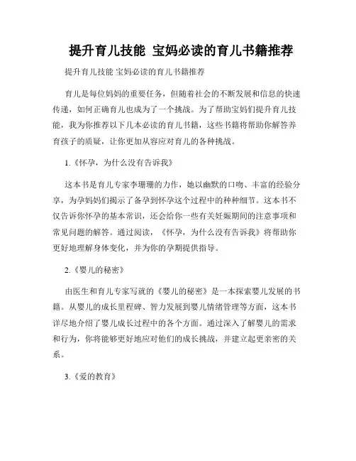 提升育儿技能宝妈必读的育儿书籍推荐提升育儿技能宝妈必读的育儿书籍推荐育儿是每位妈妈的重要任务,但随着社会的不断发展和信息的快速传递,如何正确育儿也成为了一个挑战。