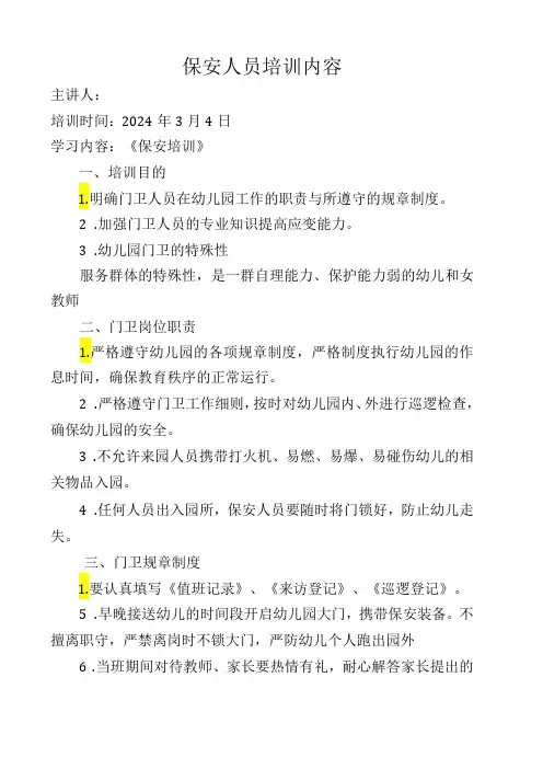 三、培训内容1. 保安员的职责与权限1.1 保安员的职责1.2 保安员的权限1.3 案例分析:职责与权限的边界2. 保安员的基本礼仪与沟通技巧2.1 保安员的形象要求2.2 基本礼仪2.3 沟通技巧2.4 案例分析:礼仪与沟通在保安工作中的应用3. 保安员的安全防范知识与技能3.1 安全检查3.2 应急预案3.3 防卫技能3.4 案例分析:安全防范知识的实际应用4. 保安员的应急处理能力4.1 紧急事件的分类与应对4.2 应急处理的基本原则4.3 应急处理流程与技巧4.4 案例分析:应急处理的实战经验5. 保安员的团队协作与自主学习能力5.1 团队协作的重要性5.2 团队协作技巧5.3 自主学习的方法与技巧5.4 案例分析:团队协作与自主学习在保安工作中的作用四、教学方法1. 理论讲解:通过PPT、视频等形式,讲解保安员相关知识。