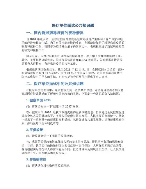 二、医疗单位面试中的公共知识题在医疗单位的面试中,经常会涉及到一些公共知识题。