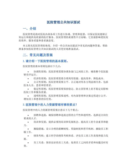 二、常见问题及答案1. 请介绍一下医院管理的基本原则。