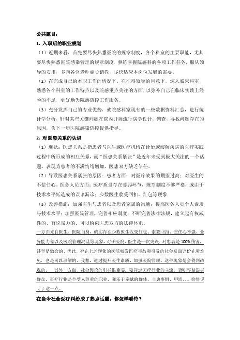 公共题目:1. 入职后的职业规划(1)近期来看,首先要尽快熟悉医院的规章制度,各个科室的主要职能,尤其要尽快熟悉医院感染管理的规章制度,熟练掌握院感科的各项工作任务,服从领导的安排,多向各位老师虚心请教,尽快适应本岗位发展的需要。