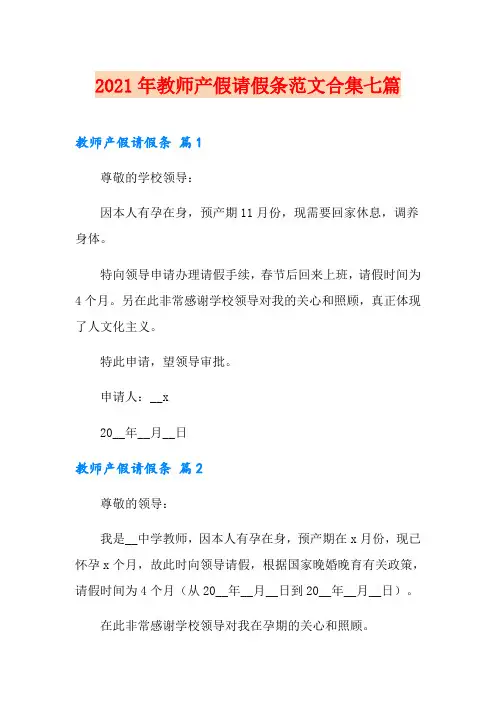 请假人:__x____年__月__日教师产假请假条篇2尊敬的xxx学校领导:我是经贸系会计专业教师,因本人有孕在身,预产期12月份,现已怀孕7个月,故此时向领导请假,请假时间为4个月。