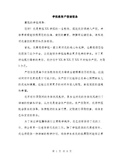 如有需要,敬请随时与我联系,谢谢!敬礼!申请人签名:XX申请日期:XX年XX月XX日关于教师产假请假条模板(二)敬启者:我是贵校的教师XXX,现就我即将休产假一事,特向您递交请假条,请批准我从(具体日期)开始休产假,休假期间大约为(具体天数)个工作日。