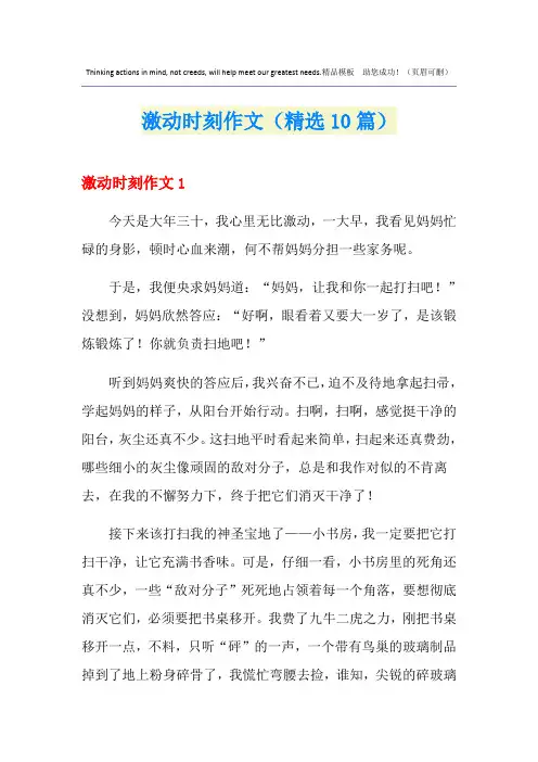 文档下载后可定制修改,请根据实际需要进行调整和使用,谢谢!并且,本店铺为大家提供各种类型的经典范文,如工作总结、工作计划、调研报告、演讲致辞、合同协议、条据文书、规章制度、教学资料、作文大全、其他范文等等,想了解不同范文格式和写法,敬请关注!Download tips: This document is carefully compiled by this editor. I hope that after you download it, it can help you solve practical problems. The document can be customized and modified after downloading, please adjust and use it according to actual needs, thank you!Moreover, our store provides various types of classic sample essays, such as work summaries, work plans, research reports, speeches, contract agreements, documents, rules and regulations, teaching materials, complete essays, and other sample essays. If you would like to learn about different sample formats and writing methods, please pay attention!最激动人心的时刻作文推荐6篇在书写作文中可以展现我们对某个问题的深入思考和独到见解,作文是一个展示自己思维深度和广度的舞台,可以让我们展现自己对问题的全面思考和独特见解,以下是本店铺精心为您推荐的最激动人心的时刻作文推荐6篇,供大家参考。