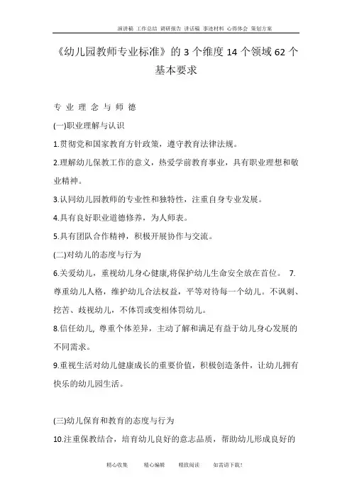 幼儿园教师专业标准的“三个维度”和“十四个领域”《幼儿园教师专业标准》包括专业理念与师德、专业知识、专业能力三个维度:它是从职业与认识、对幼儿的态度与行为等十四个领域进行阐述的,基本要求如下:专业理念与师德(一)职业理解与认识1.贯彻党和国家教育方针政策,遵守教育法律法规。