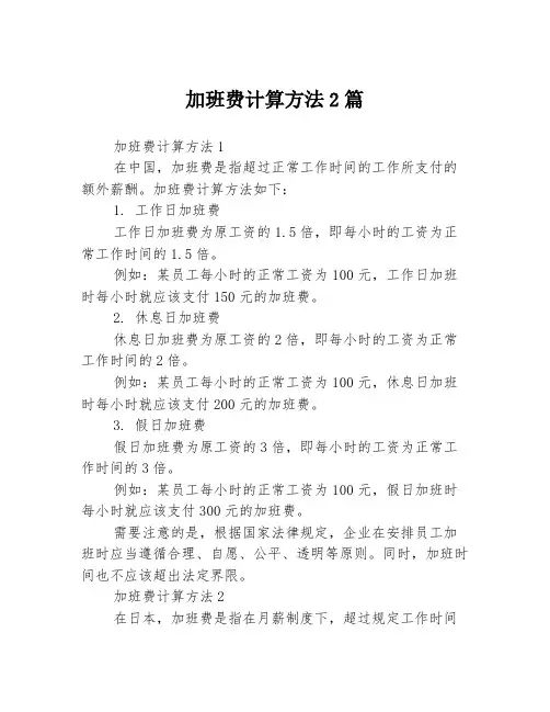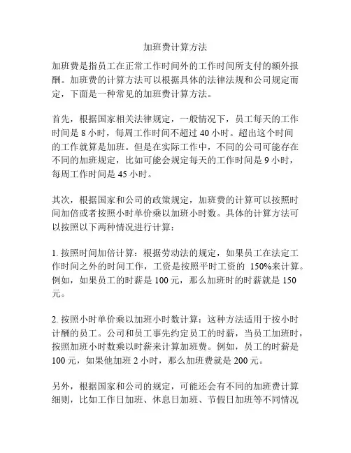 二、按小时计算法按小时计算法是根据员工实际加班时长来计算加班费。