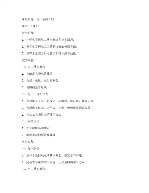 四、教学评估:1.学生的参与度和表现;教案三:电工工具和仪器一、教学目标:1.了解常用的电工工具和仪器;2.掌握电工工具和仪器的正确使用方法;3.能够正确使用电工工具和仪器进行简单的测量和修理。