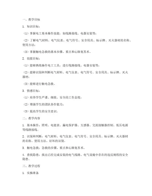 五、教学准备1. 教学场地:教室、实验室2. 教学设备:电脑、投影仪、电工工具、电线电缆、电路图、实验设备3. 教学资料:教材、PPT、实验指导书六、教学过程1. 导入新课:通过展示电工操作的实例,引发学生对电工基本操作的兴趣,激发学生的学习热情。