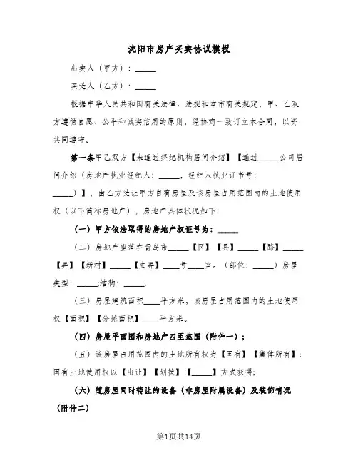 沈阳房产买卖合同范本6篇篇1沈阳房产买卖合同范本甲方(出卖人):__________(以下简称甲方)乙方(购买人):__________(以下简称乙方)鉴于甲方拥有_______的产权,并有出售该房产的意愿,乙方愿意购买该房产,经双方友好协商,就该房产的买卖事宜达成如下协议:第一条房产基本情况1. 该房产位于沈阳市__________区/县,房产地址为__________,房产面积约为__________平方米,小区名称为__________,房产产权证号为__________,产权证日期为__________。