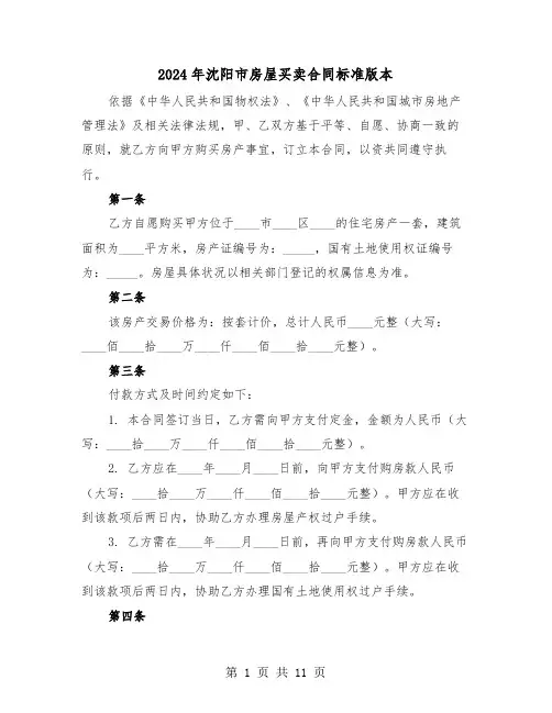 20XX 专业合同封面COUNTRACT COVER甲方:XXX乙方:XXX沈阳二手房买卖标准合同(2024版)本合同目录一览1. 买卖双方信息1.1 卖方信息1.2 买方信息2. 房屋信息2.1 房屋基本信息2.2 房屋权利及瑕疵3. 交易价格与支付方式3.1 交易价格3.2 支付方式及期限4. 房屋过户与交付4.1 过户时间及流程4.2 交付时间及条件5. 房屋质量及维修责任5.1 房屋质量保证5.2 维修责任及费用承担6. 交易费用及税费6.1 交易费用承担6.2 税费承担7. 违约责任及争议解决7.1 违约责任7.2 争议解决方式8. 合同的变更、解除与终止8.1 合同变更8.2 合同解除8.3 合同终止9. 保密条款9.1 保密内容9.2 保密期限及泄露责任10. 合同的生效、履行与终止10.1 合同生效条件10.2 合同履行10.3 合同终止11. 其他约定11.1 房屋保险11.2 房屋租赁11.3 户口迁移12. 附件12.1 房屋所有权证12.2 房屋土地使用权证12.3 房屋买卖合同范本13. 签署日期与地点13.1 签署日期13.2 签署地点14. 双方签字盖章14.1 卖方签字盖章14.2 买方签字盖章第一部分:合同如下:第一条买卖双方信息1.1 卖方信息卖方姓名:X卖方身份证号:X卖方联系方式:X卖方地址:X1.2 买方信息买方姓名:X买方身份证号:X买方联系方式:X买方地址:X第二条房屋信息2.1 房屋基本信息房屋地址:X房屋面积:X平方米房屋结构:X房屋所有权证号:X房屋土地使用权证号:X2.2 房屋权利及瑕疵卖方保证对上述房屋拥有完全的所有权,无任何抵押、债务及其他权利纠纷。