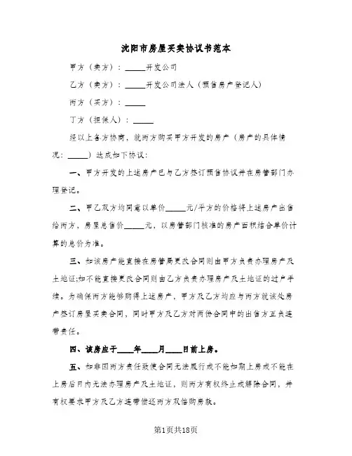 沈阳房产买卖合同范本6篇篇1【沈阳房产买卖合同范本】买方:(委托人:)身份证号:地址:卖方:(委托人:)身份证号:地址:鉴于双方自愿进行本次房产买卖交易,为明确双方权利和义务,特订立本买卖合同。