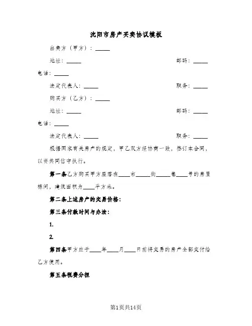 买方签字(盖章):日期:卖方签字(盖章):日期:篇2沈阳房产买卖合同范本甲方(出售方):_______(甲方名称)________,法定代表人:_______(法定代表人姓名)________,住所:_______(住所地址)________,联系电话:_______(联系电话)________。