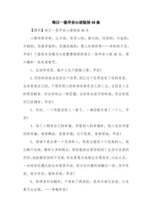 文档下载后可定制修改,请根据实际需要进行调整和使用,谢谢!并且,本店铺为大家提供各种类型的实用范文,如演讲致辞、合同协议、条据文书、策划方案、总结报告、简历模板、心得体会、工作材料、教学资料、其他范文等等,想了解不同范文格式和写法,敬请关注!Download tips: This document is carefully compiled by this editor. I hope that after you download it, it can help you solve practical problems. The document can be customized and modified after downloading, please adjust and use it according to actual needs, thank you!In addition, this store provides various types of practical sample essays, such as speeches, contracts, agreements, documents, planning plans, summary reports, resume templates, experience, work materials, teaching materials, other sample essays, etc. Please pay attention to the different formats and writing methods of the model essay!早安心语每日一语140句早安心语每日一语(140句)生活正在前方微笑,勇敢地走上前去,将彩色的人生拥抱,早安!下面是本店铺为大家整理的关于早安心语每日一语,仅供参考,喜欢可以收藏分享一下哟!早安的走心文案1、所有好运都藏在善良里。