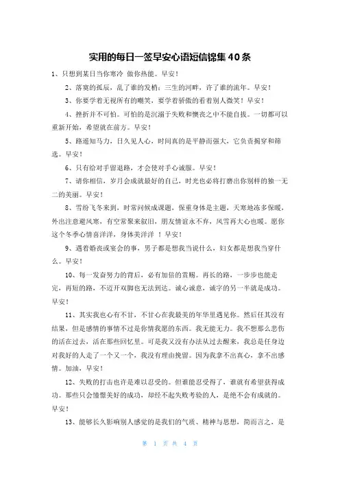 早安心语每日一语140句(实用版)编制人:__________________审核人:__________________审批人:__________________编制单位:__________________编制时间:____年____月____日序言下载提示:该文档是本店铺精心编制而成的,希望大家下载后,能够帮助大家解决实际问题。
