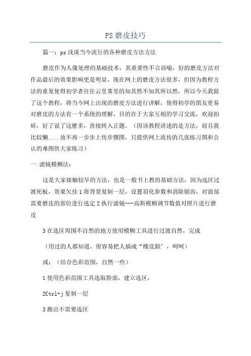 PS磨皮技巧篇一:ps浅谈当今流行的各种磨皮方法方法磨皮作为人像处理的基础技术,其重要性不言而喻,好的磨皮方法对作品最后的效果影响更是明显,现在网上的磨皮方法很多,但因为教程方法的重复使得初学者往往云里雾里的知其然不知其所以然,所以今天我做了这个教程,将当今网上出现的磨皮方法进行讲解,使得初学的朋友更易对磨皮的方法有一个系统的理解,目的在于大家互相的学习交流,欢迎拍砖,好了说了这麽多,直接转入正题。