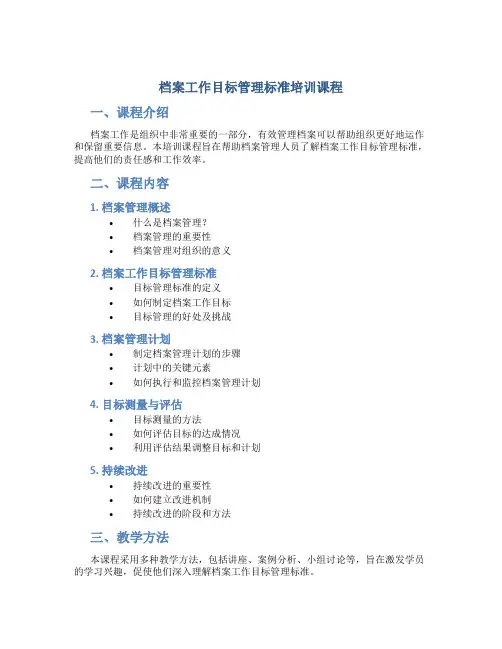 二、课程内容1. 档案管理概述•什么是档案管理?•档案管理的重要性•档案管理对组织的意义2. 档案工作目标管理标准•目标管理标准的定义•如何制定档案工作目标•目标管理的好处及挑战3. 档案管理计划•制定档案管理计划的步骤•计划中的关键元素•如何执行和监控档案管理计划4. 目标测量与评估•目标测量的方法•如何评估目标的达成情况•利用评估结果调整目标和计划5. 持续改进•持续改进的重要性•如何建立改进机制•持续改进的阶段和方法三、教学方法本课程采用多种教学方法,包括讲座、案例分析、小组讨论等,旨在激发学员的学习兴趣,促使他们深入理解档案工作目标管理标准。