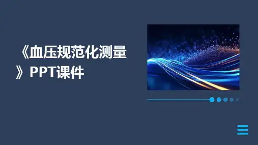 测量血压的正确方法PPT课件•引言•测量血压的基本知识•正确使用血压计的方法•常见测量问题及解决方案•家庭自测血压的注意事项•特殊人群的测量技巧与注意事项•总结与展望目录01引言提高公众对正确测量血压的认识和重视程度普及正确测量血压的方法和技巧,减少误差预防和控制高血压等心血管疾病的发生和发展目的和背景介绍血压的定义、分类和正常值范围详细阐述正确测量血压的方法和步骤分析常见测量误差及避免方法强调定期测量血压的重要性和意义01020304课件内容概述02测量血压的基本知识血压的定义和分类血压定义血压是指血液在血管内流动时对血管壁产生的侧压力,通常分为收缩压和舒张压。