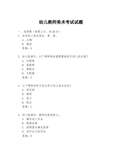 A. 正确B. 错误答案:A2. 幼儿绘画中,以下哪种颜色搭配最能吸引幼儿的注意?A. 红配绿B. 蓝配黄C. 黑配白D. 灰配紫答案:A3. 以下哪种材料不适合用于幼儿美术活动?A. 彩色纸B. 蜡笔C. 剪刀D. 胶水答案:C4. 幼儿绘画时,教师应鼓励幼儿:A. 模仿成人作品B. 随意涂鸦C. 按照固定模式绘画D. 创作自己的作品答案:D5. 幼儿美术教育的目的是什么?A. 培养幼儿的绘画技巧B. 培养幼儿的审美能力C. 培养幼儿的创造力D. 所有以上选项答案:D6. 幼儿绘画中,教师应该:A. 教授幼儿绘画技巧B. 指导幼儿完成作品C. 让幼儿自由创作D. 评价幼儿的作品答案:C7. 以下哪种绘画工具适合幼儿使用?A. 马克笔B. 油画棒C. 铅笔D. 毛笔答案:B8. 幼儿绘画时,教师应该:A. 指导幼儿如何使用颜色B. 告诉幼儿如何构图C. 让幼儿自由发挥D. 纠正幼儿的错误答案:C9. 幼儿美术活动中,教师的角色是:A. 指导者B. 评价者C. 观察者D. 所有以上选项答案:D10. 幼儿绘画时,教师应该:A. 鼓励幼儿使用多种颜色B. 限制幼儿使用颜色的数量C. 让幼儿只使用一种颜色D. 规定幼儿使用特定的颜色答案:A二、简答题(每题10分,共40分)1. 描述幼儿绘画的特点,并说明教师应如何引导。
