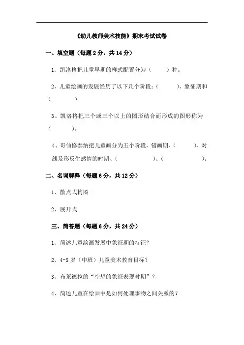 《幼儿教师美术技能》期末考试试卷一、填空题(每题2分,共14分)1、凯洛格把儿童早期的样式配置分为()种。