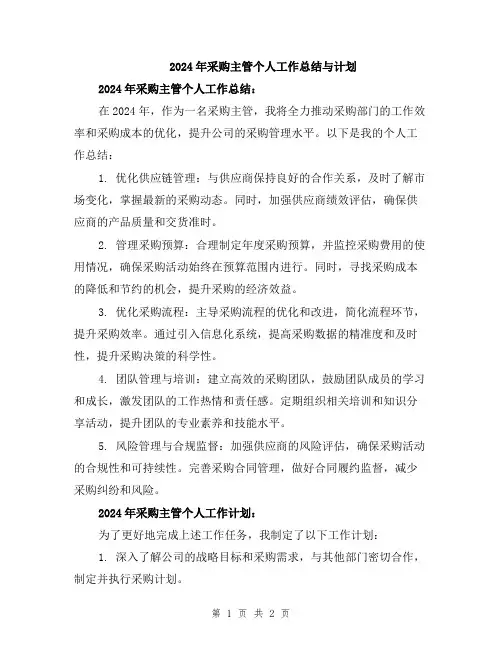2024年采购主管个人工作总结与计划2024年采购主管个人工作总结:在2024年,作为一名采购主管,我将全力推动采购部门的工作效率和采购成本的优化,提升公司的采购管理水平。