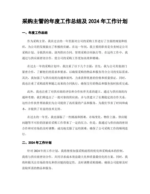 一、工作总结作为采购主管,我在2024年主要负责公司的采购工作。