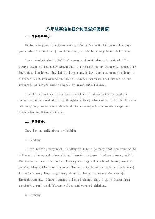 八年级英语自我介绍及爱好演讲稿一、自我介绍部分。
