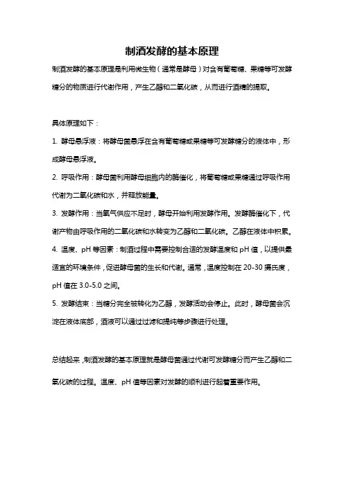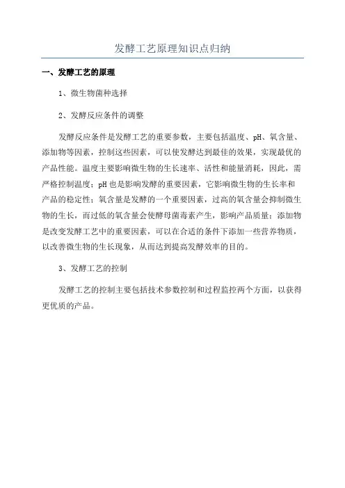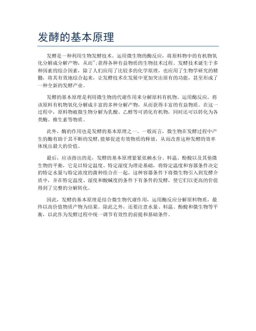 一、发酵的原理发酵是一种微生物代谢过程,它在缺氧条件下进行。