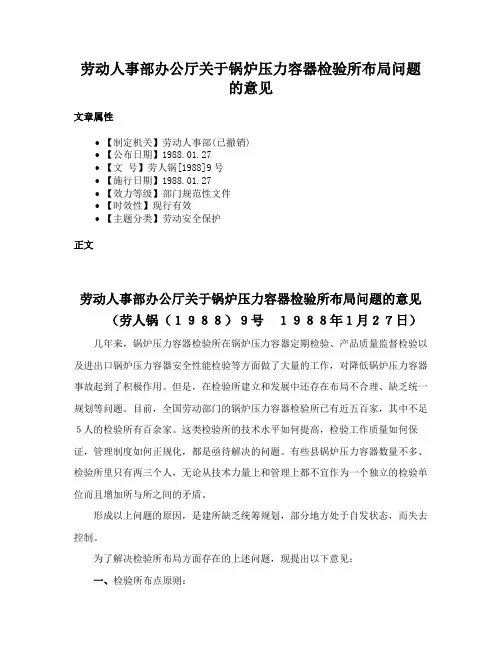 劳动人事部办公厅关于锅炉压力容器检验所布局问题的意见文章属性•【制定机关】劳动人事部(已撤销)•【公布日期】1988.01.27•【文号】劳人锅[1988]9号•【施行日期】1988.01.27•【效力等级】部门规范性文件•【时效性】现行有效•【主题分类】劳动安全保护正文劳动人事部办公厅关于锅炉压力容器检验所布局问题的意见(劳人锅(1988)9号1988年1月27日)几年来,锅炉压力容器检验所在锅炉压力容器定期检验、产品质量监督检验以及进出口锅炉压力容器安全性能检验等方面做了大量的工作,对降低锅炉压力容器事故起到了积极作用。