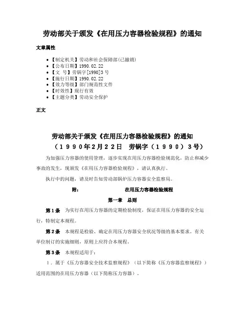 劳动部关于颁发《在用压力容器检验规程》的通知文章属性•【制定机关】劳动和社会保障部(已撤销)•【公布日期】1990.02.22•【文号】劳锅字[1990]3号•【施行日期】1990.02.22•【效力等级】部门规范性文件•【时效性】现行有效•【主题分类】劳动安全保护正文劳动部关于颁发《在用压力容器检验规程》的通知(1990年2月22日劳锅字(1990)3号)为加强压力容器的使用管理,逐步实现在用压力容器检验规范化,防止和减少事故的发生,现颁发《在用压力容器检验规程》,请认真执行。