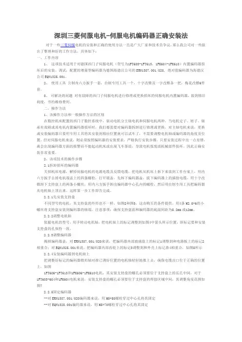 深圳三菱伺服电机-伺服电机编码器正确安装法对于一些三菱伺服电机的安装和正确的使用方法一直是广大厂家和技术员争议,那么我公司对一些做出了整理和好的工作方法,具体如下:一、工作内容1、这项技术适用于对德国西门子伺服电机(型号为1FT603-1FT613,1FK604-1FK610)内置编码器损坏后的安装、调试,配置的增量型编码器为德国海德汉公司的ERN1387.001/020, 绝对值编码器为海德汉公司EQN1325.001。