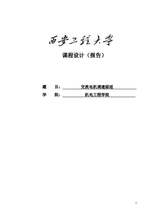 课程设计(报告)题目:交流电机调速综述学院:机电工程学院摘要最近几年,随着新型电力电子器件的不断涌现和计算机技术的飞速发展,高性能的交流电动机变频调速系统得到了广泛的应用,它的显著的节能效果和灵活的运行方式,给人们留下了深刻的印象。