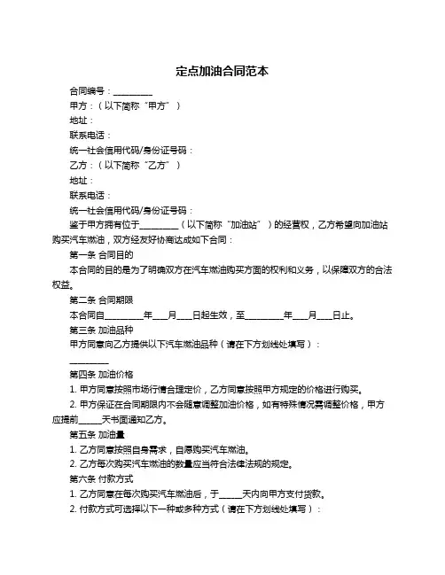 感谢您的配合!篇2车辆定点加油协议样板一、甲方(加油站名称):_______________乙方(车主姓名):_______________甲乙双方经友好协商,就甲方为乙方所使用的车辆定点加油事宜,达成如下协议:二、乙方同意将其车辆在甲方指定加油站进行加油,并按照约定的加油量、加油时间、加油方式进行操作。