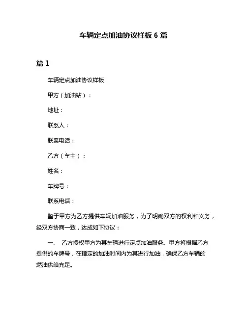 车辆定点加油协议样板6篇篇1车辆定点加油协议样板甲方(加油站):地址:联系人:联系电话:乙方(车主):姓名:车牌号:联系电话:鉴于甲方为乙方提供车辆加油服务,为了明确双方的权利和义务,经双方协商一致,达成如下协议:一、乙方授权甲方为其车辆进行定点加油服务。