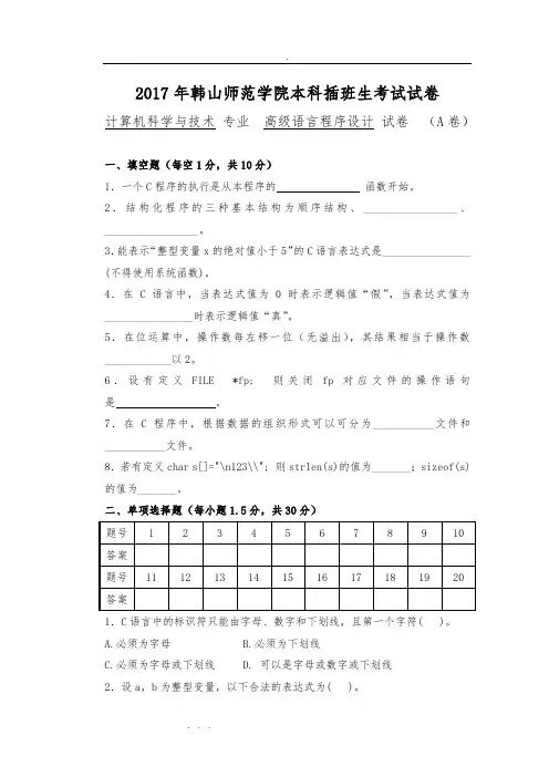 2017年韩山师范学院本科插班生考试试卷计算机科学与技术专业高级语言程序设计试卷(A卷)一、填空题(每空1分,共10分)1.一个C程序的执行是从本程序的函数开始。