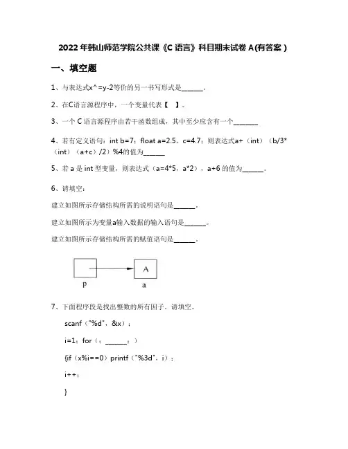 2022年韩山师范学院公共课《C语言》科目期末试卷A(有答案)一、填空题1、与表达式x^=y-2等价的另一书写形式是_______。
