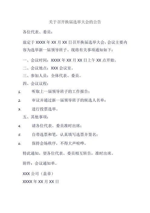兹定于XXXX年XX月XX日召开换届选举大会,会议主要内容为选举新一届领导班子。