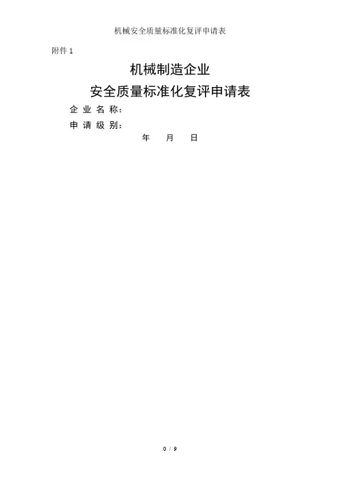 附件一:企业安全生产标准化评审申请申请企业:申请行业:专业:申请性质:等级:申请日期:年月日国家安全生产监督管理总局制一、基本情况表申请企业地址企业性质安全管理机构员工总数人专职安全管理人员人特种作业人员人固定资产万元主营业务收入万元倒班情况□有□没有倒班人数及方式法定代表人电话传真联系人电话传真手机电子信箱本次申请□初次评审□延期□一级□二级□三级本次申请前本专业曾经取得的标准化等级:□一级□二级□三级□无本次申请的专业外,已经取得的企业安全生产标准化专业、等级和时间:如果企业是某企业集团的成员单位,请注明企业集团名称:如果已取得职业健康安全管理体系认证证书,请注明证书名称和发证机构:本企业安全生产标准化自评小组主要成员姓名所在部门职务/职称电话备注组长成员二、企业重要信息表1.企业概况:2.近三年本企业重伤、死亡或其他重大生产安全事故和职业病的发生情况:3.安全管理状况(主要管理措施及主要绩效):4.有无特殊危险区域或限制的情况:三、其他事项表1.企业是否同意遵守评审要求,并能提供评审所必需的真实信息?□是□否2.企业在提交申请书时,应附以下文件资料:◇安全生产许可证复印件(未实施安全生产行政许可的行业不需提供) ◇工商营业执照复印件◇安全生产标准化管理制度清单◇安全生产组织机构及安全管理人员名录◇工厂平面布置图◇重大危险源资料◇自评报告◇自评扣分项目汇总表◇评审需要的其他材料3.企业自评评分:4.企业自评结论:法定代表人(签名):(申请企业盖章)年月日5.上级主管单位意见:负责人(签名):(主管单位盖章)年月日6.安全生产监督管理部门意见:负责人(签名):(安全监管部门盖章)年月日申请材料填报说明1.“申请企业”填写申请企业名称并加盖申请企业章。