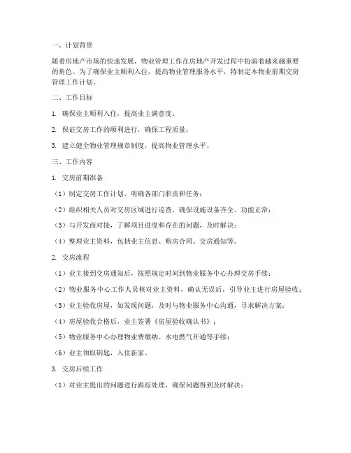 二、物业管理公司交房方案的意义和目的1. 满足业主需求业主在购房后,最关心的就是物业的服务和质量。