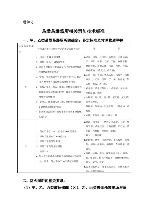 附件6易燃易爆场所相关消防技术标准二、防火间距的相关要求:(1)甲、乙、丙类液体储罐(区),乙、丙类液体桶装堆场与周边建筑的防火间距:(2)可燃气体储罐与周边建筑间距:度比空气大时,应按该表的规定增加25%;当可燃气体的密度比空气小时,可按该表的规定确定;(3)厂区内及周边地块建筑的防火间距要求:常用数据(详细数据见列表):1、甲、乙类厂房(仓库)与单、多层民用建筑不应小于25米;与高层民用建筑不应小于50米;2、甲、乙类厂房(仓库)之间的防火间距不应小于12米;3、甲类厂房(仓库)与单多层丙类厂房防火间距不应小于12米;乙类厂房(仓库)与单多层丙类厂房防火间距不应小于10米;(4)甲、乙类仓库与周边建筑的防火间距要求:三、占地面积及防火分区相关要求(1)、甲、乙类厂房防火分区要求:倍。