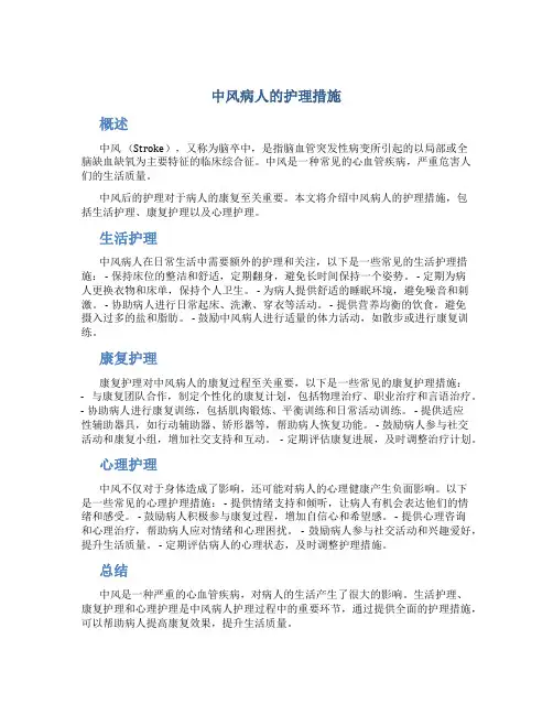 中风病人的护理措施概述中风(Stroke),又称为脑卒中,是指脑血管突发性病变所引起的以局部或全脑缺血缺氧为主要特征的临床综合征。