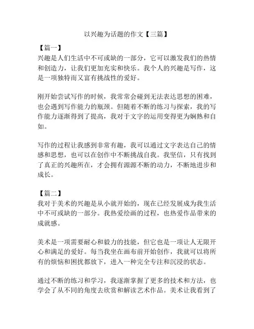 文档下载后可定制修改,请根据实际需要进行调整和使用,谢谢!并且,本店铺为大家提供各种类型的经典范文,如工作报告、演讲致辞、条据文书、合同协议、心得体会、自我鉴定、规章制度、教学资料、作文大全、其他范文等等,想了解不同范文格式和写法,敬请关注!Download tips: This document is carefully compiled by this editor. I hope that after you download it, it can help you solve practical problems. The document can be customized and modified after downloading, please adjust and use it according to actual needs, thank you!Moreover, our store provides various types of classic sample essays, such as work reports, speeches, written documents, contract agreements, insights, self-evaluation, rules and regulations, teaching materials, complete essays, and other sample essays. If you want to learn about different sample formats and writing methods, please pay attention!兴趣爱好类作文6篇融入真实的感受使作文更具情感共鸣,读者更容易被其所打动和感动,作文主题的选择要符合读者的阅读需求,才能吸引他们的注意力和支持,以下是本店铺精心为您推荐的兴趣爱好类作文6篇,供大家参考。