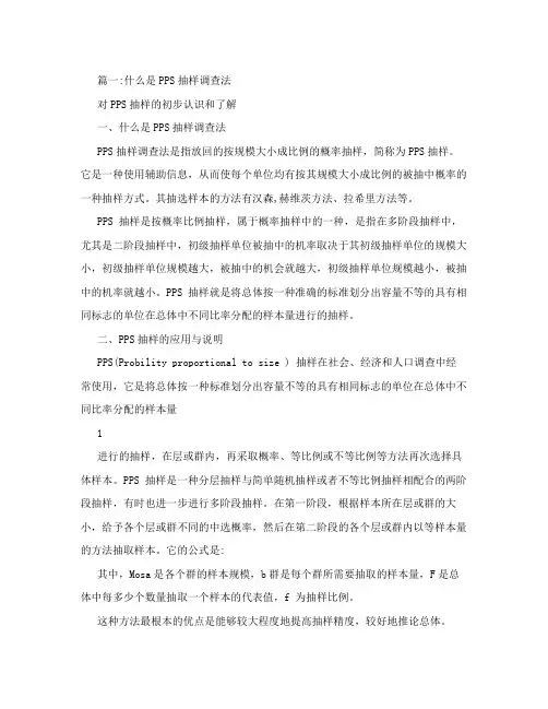 篇一:什么是PPS抽样调查法对PPS抽样的初步认识和了解一、什么是PPS抽样调查法PPS抽样调查法是指放回的按规模大小成比例的概率抽样,简称为PPS抽样。