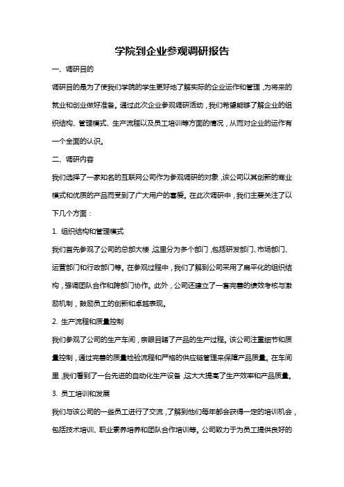 企业参观调研报告一、引言近年来,随着全球化和数字化的快速发展,企业参观调研成为了一种常见的学习和交流方式。