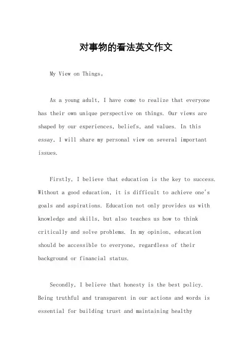 As a young adult, I have come to realize that everyone has their own unique perspective on things. Our views are shaped by our experiences, beliefs, and values. In this essay, I will share my personal view on several important issues.Firstly, I believe that education is the key to success. Without a good education, it is difficult to achieve one's goals and aspirations. Education not only provides us with knowledge and skills, but also teaches us how to think critically and solve problems. In my opinion, education should be accessible to everyone, regardless of their background or financial status.Secondly, I believe that honesty is the best policy. Being truthful and transparent in our actions and words is essential for building trust and maintaining healthyrelationships. Dishonesty can lead to misunderstandings, conflicts, and even legal consequences. Therefore, it is important to always be truthful, even if it means admitting our mistakes or shortcomings.Thirdly, I believe that respect and empathy are crucial in our interactions with others. We should treat everyone with kindness and understanding, regardless of their race, gender, religion, or social status. By doing so, we can create a more inclusive and harmonious society. Additionally, we should listen to others' perspectives and try to understand their point of view, even if we disagree with them.Lastly, I believe that we should take care of our environment. Our planet is facing numerous environmental challenges, such as climate change, pollution, and deforestation. It is our responsibility to take action and protect our natural resources for future generations. We can do this by reducing our carbon footprint, conserving energy and water, and supporting eco-friendly initiatives.In conclusion, my view on things is based on the principles of education, honesty, respect, empathy, and environmental responsibility. By embracing these values, we can make a positive impact on our lives and the world around us.。